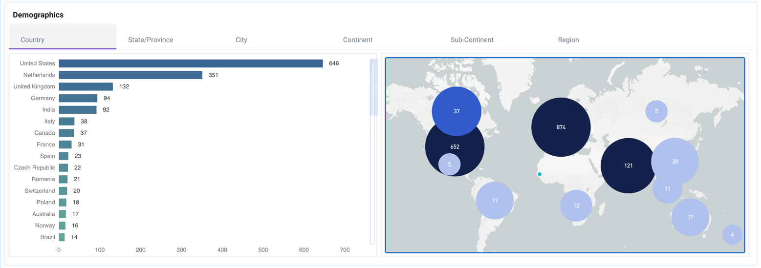 Use this chart and graph to get insights into the geographical locations of your users. Features include: