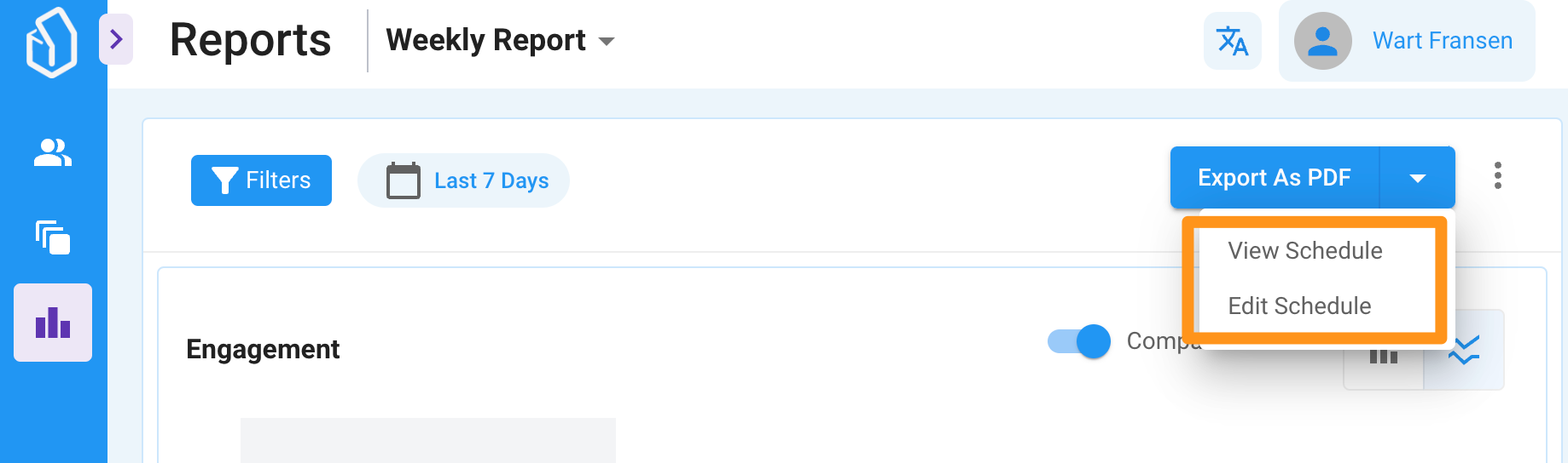 Click the dropdown icon next to the 'Export as PDF" button and create a new scheduled Reports.