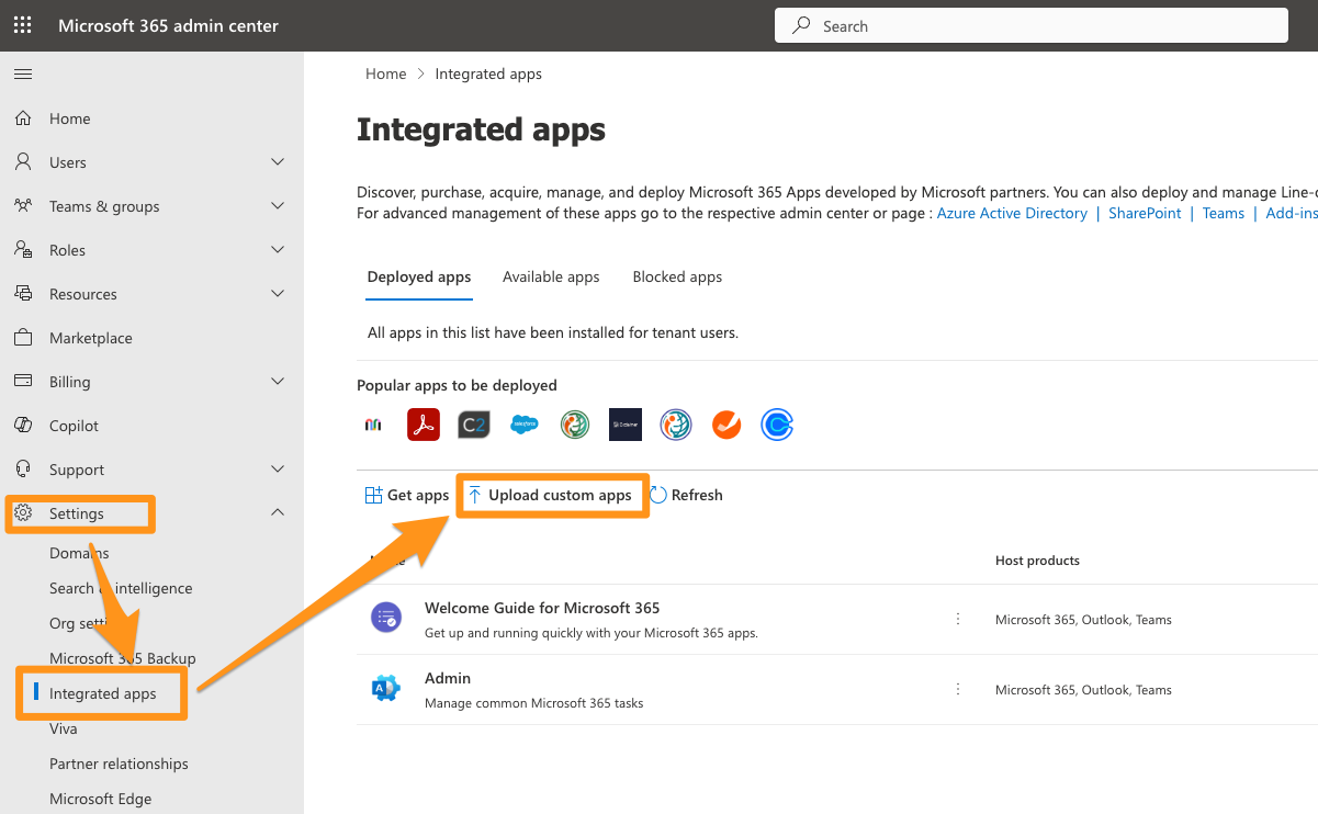 2. Go to Settings > Integrated apps, and click **Upload Custom Apps**