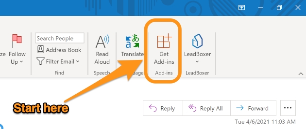 In your Outlook application, click on the Get Add-ins button, located in the top of your application