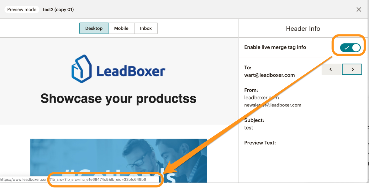 (1) Once you have edited the links, (2) save your newsletter, and (3) test the links by hovering or clicking on them in the preview (enable merge tags in your preview). You should see the user ID and other fields appended to the url on your landing page:
