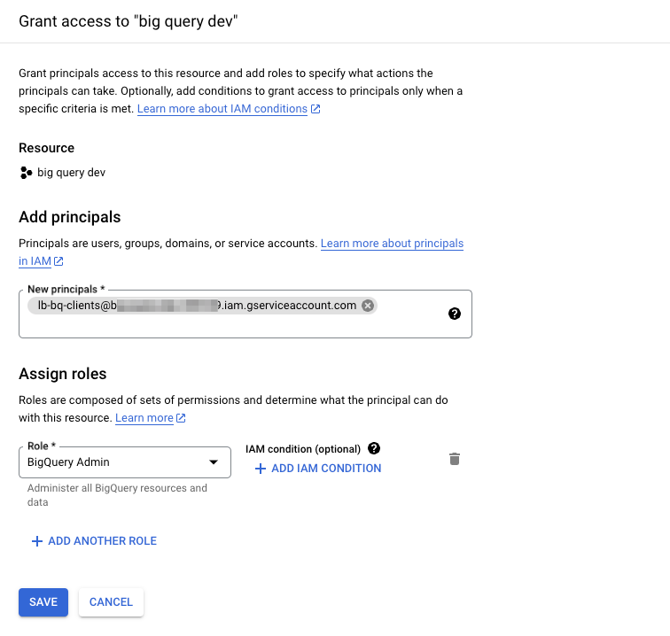 <figure><img src="https://1941892698-files.gitbook.io/~/files/v0/b/gitbook-x-prod.appspot.com/o/spaces%2F-M_u92JFMboVvSv_dif4%2Fuploads%2FRAjywAS5A0JkIJLVNptx%2FIAM_%E2%80%93_IAM___Admin_%E2%80%93_big_query_dev_%E2%80%93_Google_Cloud_console.png?alt=media&#x26;token=f624d108-10d7-46bb-ac74-f22da87ade5f" alt=""><figcaption></figcaption></figure>