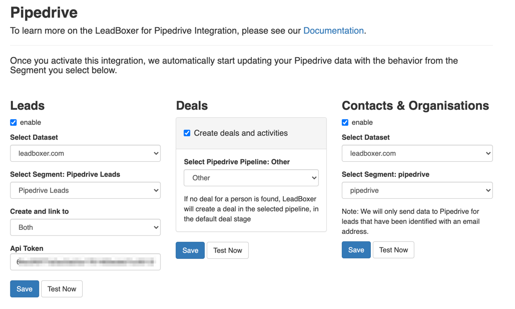 Pipedrive has not yet added the Leads integration into their authentication workflow, so for the leads integration you will need to add your Pipedrive API key. (instructions on obtaining your API keyarrow-up-right)