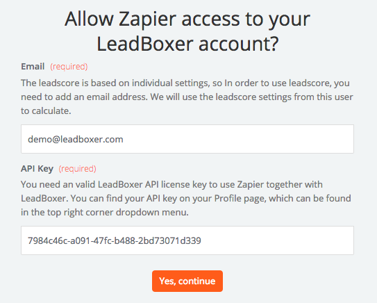Paste your key back into your Zapier account and then “Continue”. If your email and API key was entered correctly your LeadBoxer account will now be successfully connected.