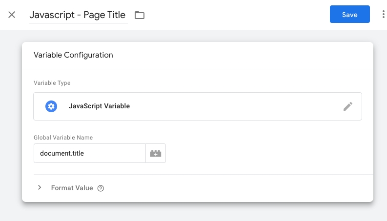 First you need to define a new variable to grab the page title (for some reason GTM does not provide this variable by default so we need to define it ourselves) In your Google Tag Manager container, go to Variables > Javascript Variable and enter