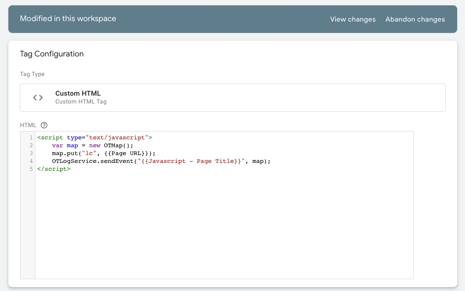 <script type="text/javascript"> var map = new OTMap(); map.put("lc", {{Page URL}}); OTLogService.sendEvent("{{Javascript - Page Title}}", map); </script>